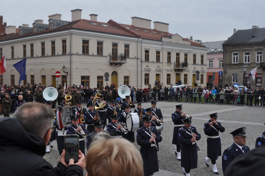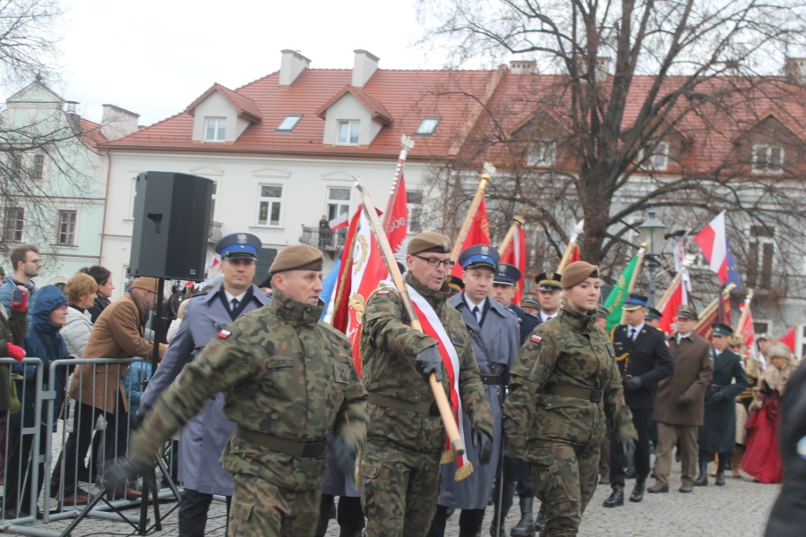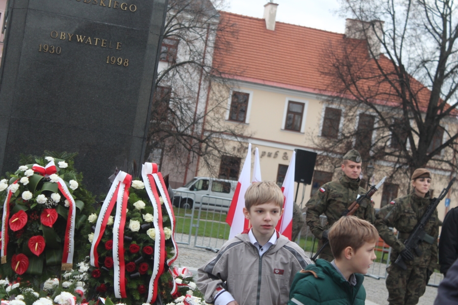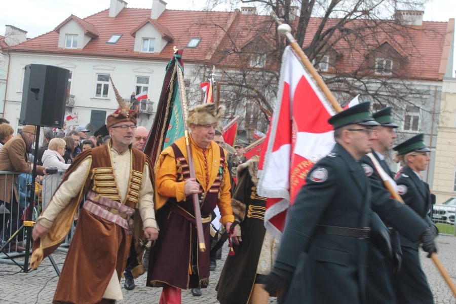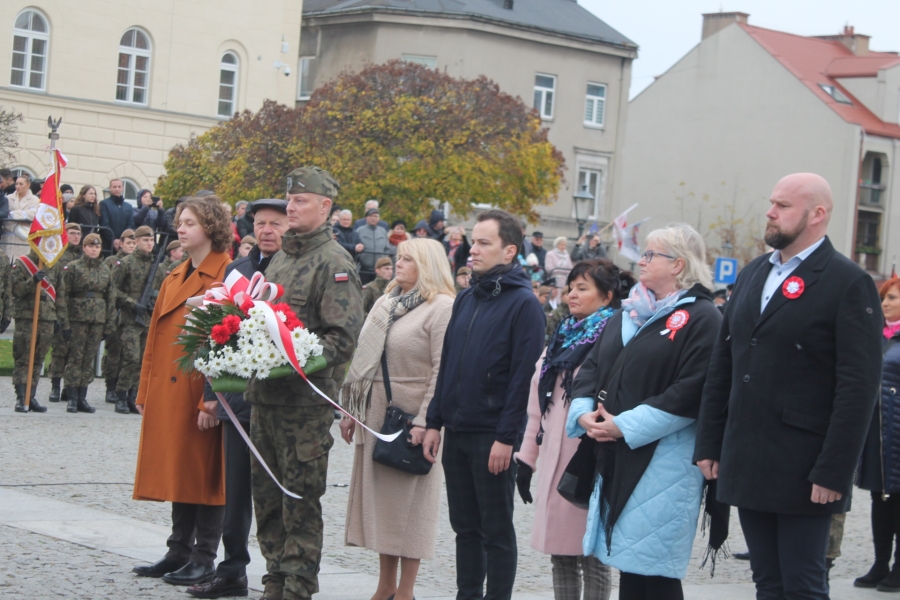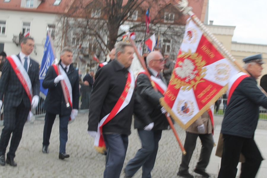 Goście i organizatorzy Święta Niepodległości,  nadający ton rocznicowej uroczystości , kontynuowanej na Rynku przy Pomniku Czynu Legionów Józefa Piłsudskiego,  akcentowali