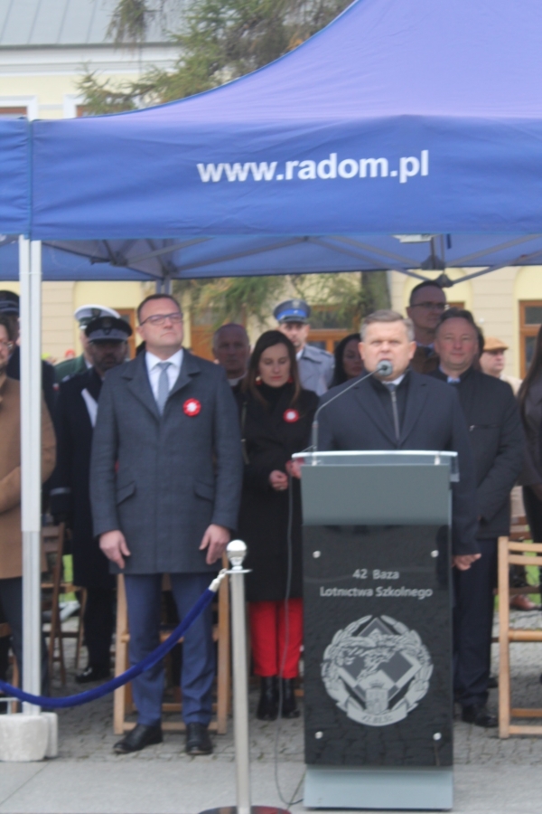 Prezydent Radomia Radosław Witkowski stwierdził , że Polska przetrwała dzięki silnym  tradycjom patriotycznym. Składamy dzisiaj hołd pokoleniom, której idee polskości przechowały i które za nią ginęły - mówił. Przypomniał, że nasze miasto było pierwszym miastem w Królestwie Polskim, które 2 listopada 1918 roku proklamowało Republikę Radomską. Nastąpiło to po rozbrojeniu Austriaków przez odważnych mieszkańców. Od siebie dodamy, że miastem zarządzał ,,Komitet Pięciu” złożony z nastawionych niepodległościowo radomian, reprezentujących jednak rożne orientacje ideowe i polityczne. Byli to: lekarz Stanisław Kelles-Krauz, socjalista, w latach 1930- 1938 – senator RP, adwokat Jan Wigura,  działacz Ligi Narodowej i Narodowego Związku Robotniczego (w jego mieszkaniu przy obecnej ul. J. Piłsudskiego ukonstytuował się ,,Komitet Pięciu”), adwokat Roman Szczawiński, działacz PPS, w latach 1934-1938 prezydent Radomia, Aleksy Rżewski, mianowany 8 listopada komisarzem Radomia, w latach 1919- 1923 – prezydent Łodzi i Wacław Dębowski, w latach 1916-1918 – wiceprezydent Radomia.